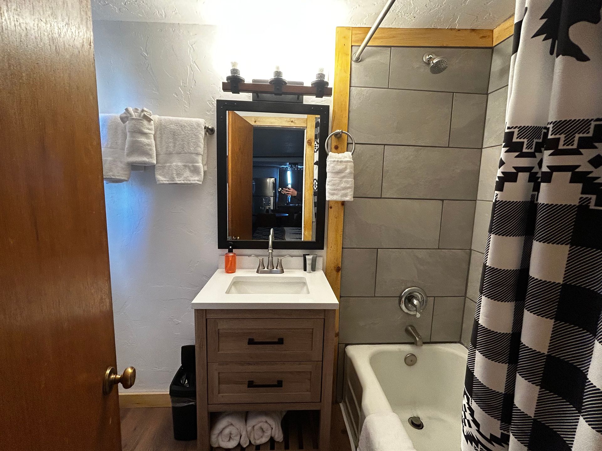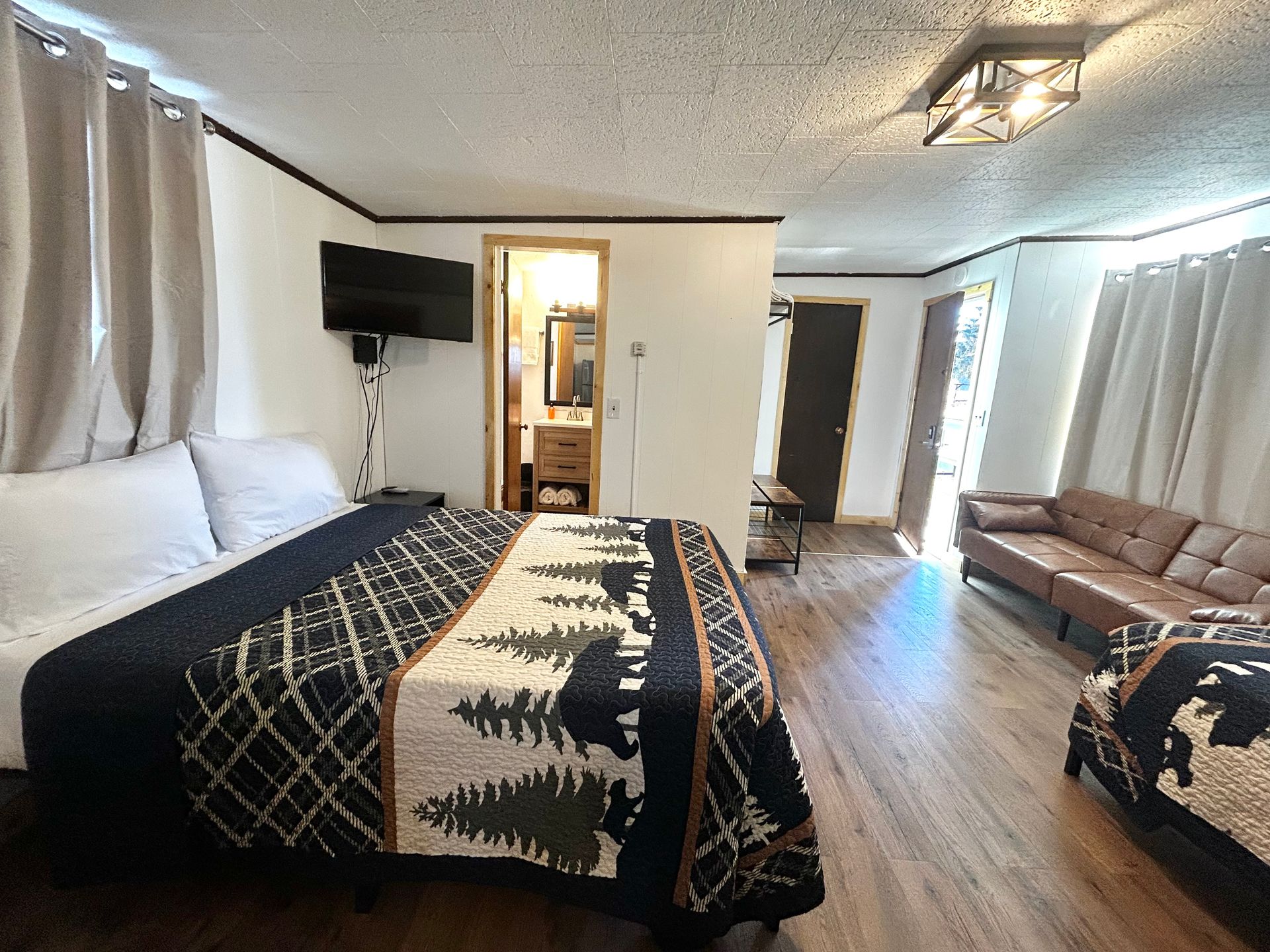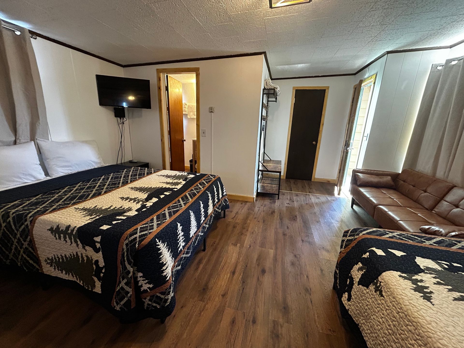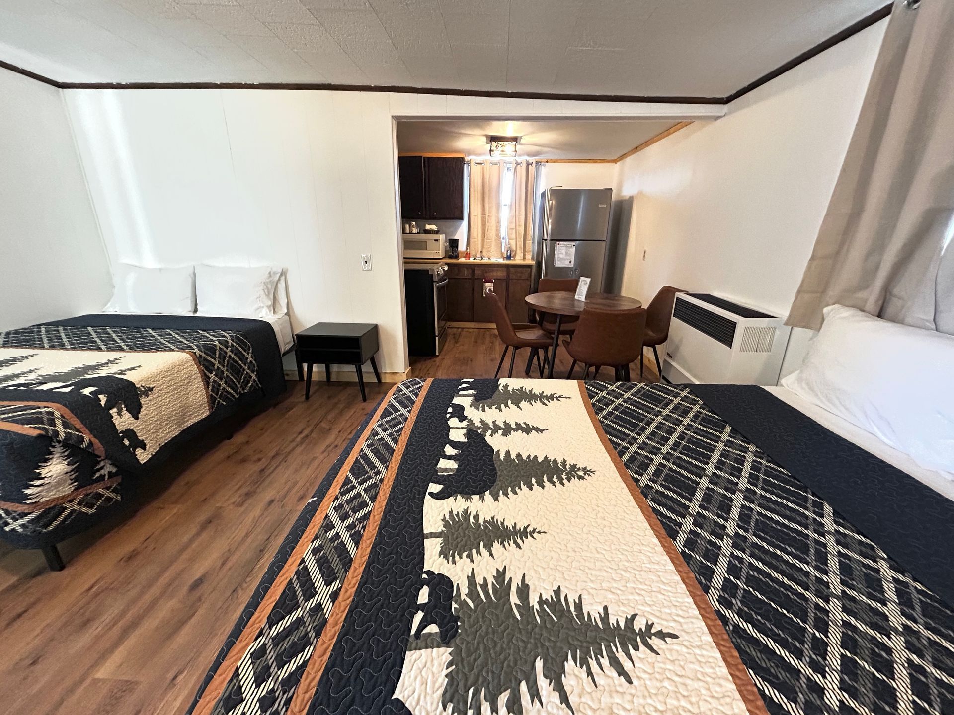 Our 2025/2026 model- two queen beds with full interior and bathroom renovations. Microwave, swivel tv, mini fridge, and a coffee pot for convenience. Espresso bar in the lobby available during open hours!
